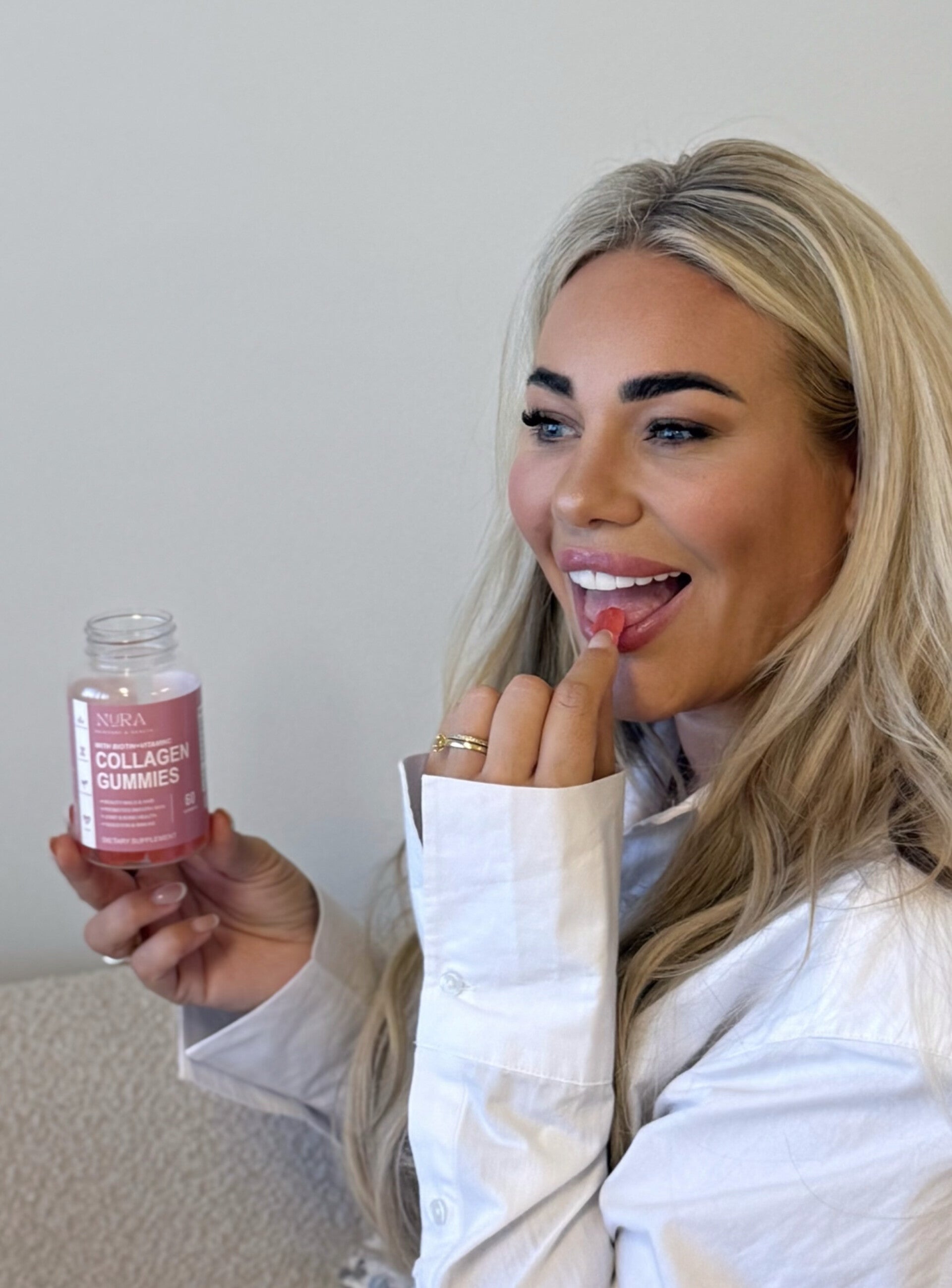 “De collageen gummies van NURA hebben mijn huid aanzienlijk verbeterd en ik voel me zelfverzekerder dan ooit. Ik kan niet meer zonder!”